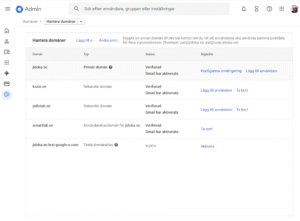 Källa: Google Admin | Följande domäner är hanterade genom Google mail. Åtkomst genom att konfigurera MX poster i Domänhanterare